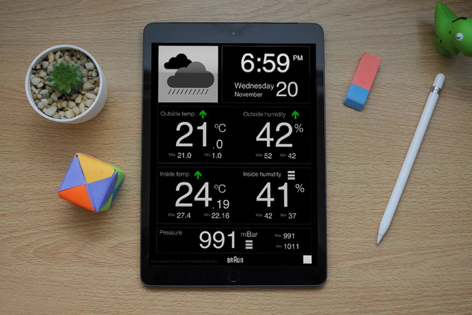 I was commissioned to research & develop adding connectivity to the existing range of Braun weather stations (produced under license by Zeon Ltd). The main base station is a WiFi base station, and creates an AdHoc network for initial setup, if WPS is not available. The external sensor communicates to the internal main unit using 433Mhz. One of the most critical aspects of this design is the user setup procedure. It was designed to be as simple as possible - preventing user frustration.