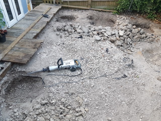 Clearing the old conservatory base piles.